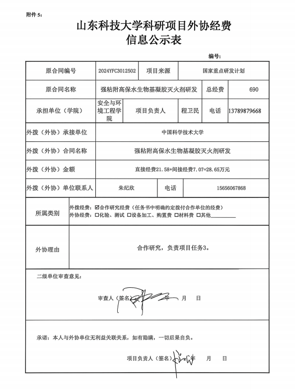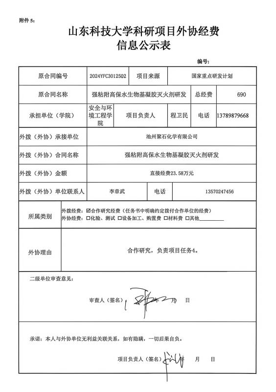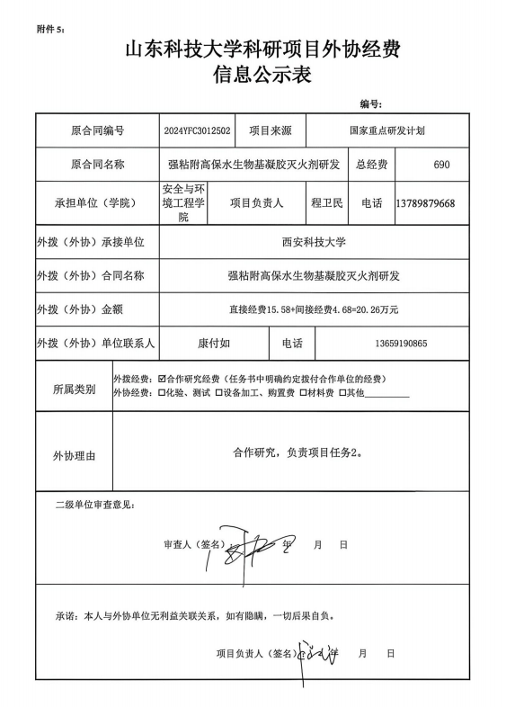 根据《山东省人民政府办公厅印发关于进一步完善财政科研项目资金管理的若干措施的通知》(鲁政办字〔2019〕120号)以及《山东科技大学科研项目与经费管理办法(试行)》(山科大发〔2020〕64号)相关规定,现对程卫民为项目负责人的强粘附高保水生物基凝胶灭火剂研发项目的外协经费情况进行公示,公示时间为 2026年4月20日~2026年4月24日(公示时间不少于5个工作日)。若对本项外协经费有异议,请于公示期内向h视频-免费h视频 或科技处反映并提交书面材料。